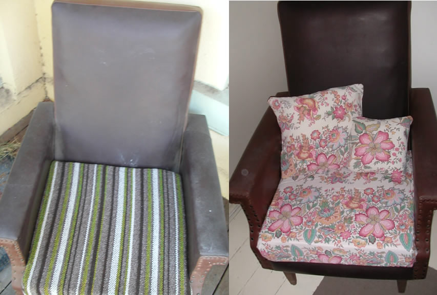However instead of gallivanting around outside I spent the day trawling through clothes for the op shop (3 big bags worth) and sorting out the spare room, i mean studio . . it doesn’t take long to get messy. plus I had these old vinyl armchairs that needed cleaning and new cushions. I have cleared a space for one to come inside, and used an old sheet of mums for its new lease of life.