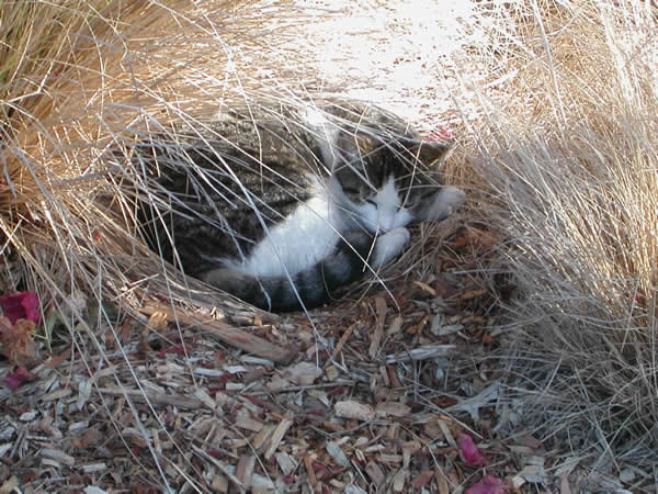 so my 6th folder is ‘garden’ and the 6th pic is of this little neighborhood cat sleeping under the tussocks on the naturestrip at the corner of my street. I had to get a photo as it looked like a great spot to have a catnap amongst the woodchips. My neighborhood has lots of cats, which includes my own, mia. Here she is lying in my garden near the gas meter, squashing my cushion bushes!