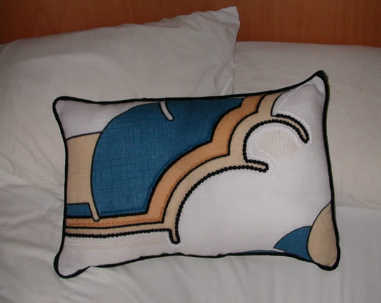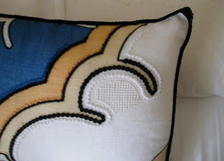 I love the detail in the stitching and the bold art deco design. I added some twisted cord piping, a black zip from Savers and used a seeded cream cotton drill for the back. I think it’ll be for my bed.