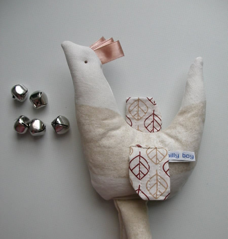 This delightful little bird is a one-off handmade softie made with a soft cream and beige fabric with a ribbon crest. With dangly legs and a bell inside for a little jingle, this softie makes a great present for littlies. It has large french knot embroidered eyes and is filled with non-allergenic polyester fibre filling. This bell bird is about 13cm (5in) across and retails for $26.
