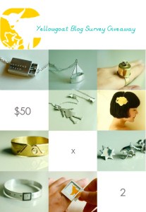 ooh, i just found this delightful blog by yellow goat who is having some lovely giveaways, including a $50 usd voucher giveaway to complete a quick survey about her blog. Worthwhile, I’d love to be able to purchase one of the gorgeous bracelets or pendants. Go and take a look!!