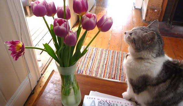 see evidence! I got up this morning to tulip destruction, and then sprung the cat contemplating her next victim.. i don’t know why she likes eating tulips out of all the flowers.