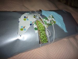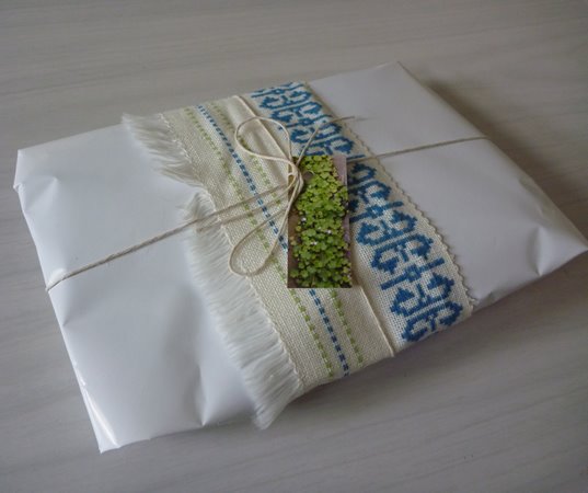 I also recently sold a jingle bird, and I have been trying different packaging and wrapping styles where I can use fabric scraps. Here’s what I ended up sending off.