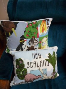 I think I have a New Zealand tea towel obsession! I found these tea towels on my last NZ visit and had to make them into cushions for my lounge. They take five minutes to make, I just cut a tea towel in half across the middle and sew in a long zip the same colour as the border. They have an art deco feel to me. Maybe its the writing style. They also remind me of my brother and his family living in NZ, so nice to have on the couch at home.