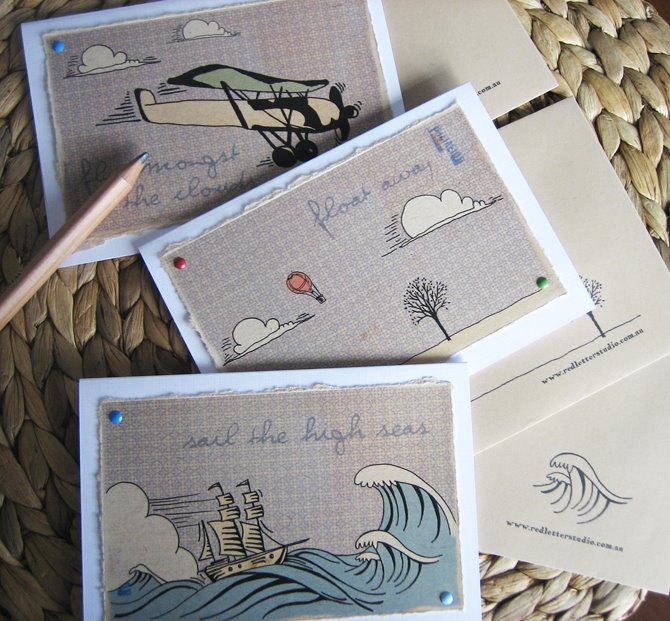 And also a mention to my other latest read, Red Letter Studio who has some gorgeous stationery and is a talented graphic designer with a lovely blog. She purchased one of my fav jingle birds. I love her travel cards (below and found on madeit) and i know my mum would love the bird ones.