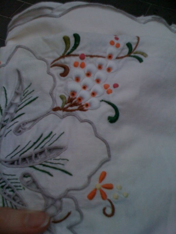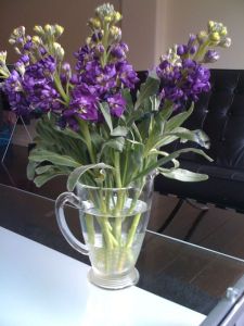 I discovered yesterday the Bendigo RSPCA op shop when I went to buy a decent size mug for my morning tea, and I couldn’t resist going back for a vase, well, a lovely old glass jug. Then I had to grab some purple stocks to brighten up the coffee table. Also I couldn’t resist some pre-loved linen with bag or scarf potential and a stunning embroidered tablecloth. The pic doesn’t do the colour of it justice. My Grandma hand embroidered one that was similar but all in shades of cream.